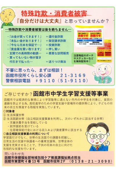 函館市などからのお知らせを掲載しています。こだて11月号 [市のお知らせ]函館市地域公共交通協議会からのお知らせです。市内の公共交通機関(電車・バス)では年末年始、お盆、学校休業中などに、通常のダイヤとは異なるダイヤで運 […]
